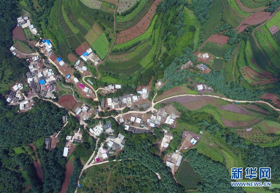 8月26日无人机拍摄的大滴水村新貌。 云南省寻甸回族彝族自治县塘子街道团结社区大滴水村四面环山,农民原先居住的房子大都是老旧土坯房,村民出行困难,生存和居住环境较差。在各级政府的帮扶下,大滴水村如今修通了水泥硬化路,村民搬进了新建的房屋,通过发展种养殖业,山村农民的生活日渐红火。 新华社记者 杨宗友 摄
