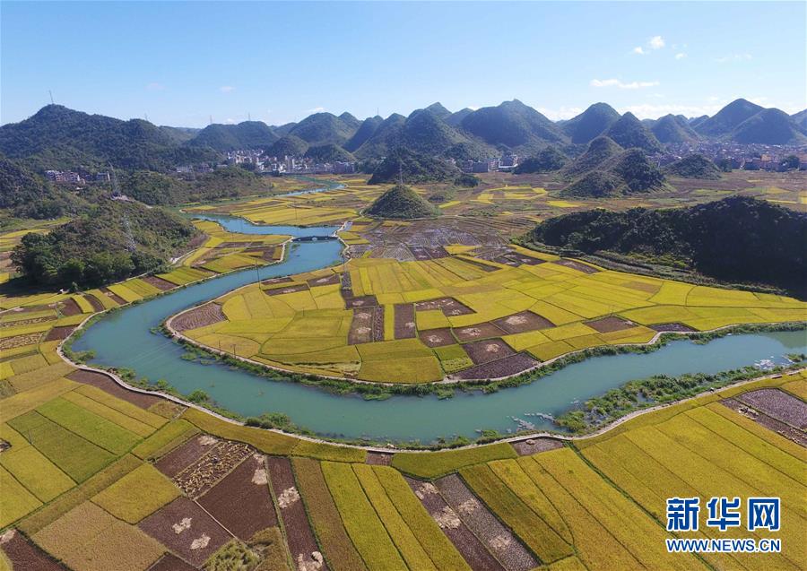 这是广南县八宝镇坝龙村的稻田景色(9月20日无人机拍摄)。 云南省文山壮族苗族自治州广南县八宝镇今年种植优质水稻22000余亩,秋收季节,田野里一片金黄,景色如画。 新华社记者杨宗友摄