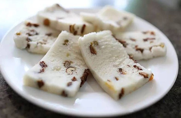 据史料记载,重阳糕又称花糕、菊糕、五色糕,制无定法,较为随意。 九月九日天明时,以片糕搭儿女头额,口中念念有词,祝愿子女百事俱高,乃古人九月作糕的本意。讲究的重阳糕要作成九层,像座宝塔,上面还作成两只小羊,以符合重阳(羊)之义。有的还在重阳糕上插一小红纸旗,并点蜡烛灯。这大概是用“点灯”、“吃糕”代替“登高”的意思,用小红纸旗代替茱萸。当今的重阳糕,仍无固定品种,各地在重阳节吃的松软糕类都称之为重阳糕。