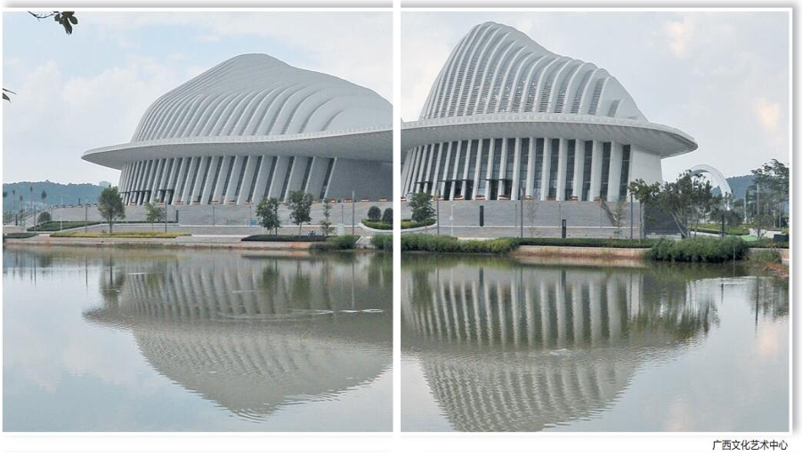 广西文化艺术中心由3座巍峨壮观的白色半圆形建筑组成,倒映在人工湖中,仿若一幅依山傍水的山水画,别具壮乡风情。走进广西文化艺术中心音乐厅,这里可容纳1200名观众,配备有大型管风琴、约3.7米钢琴等大型乐器,完全满足交响乐、大型音乐会等演出要求。