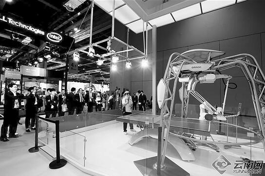 在智能及高端装备展区上,会组装汽车的点焊机器人协同作战,拼装现场极为吸睛。而令人称奇的,是一台欧姆龙FORPHEUS乒乓球机器人,现场与参观者即兴对打,“小球”在台面上你来我往,引起围观者的阵阵掌声。不过这台机器人并不像AlphaGo一样,要战胜围棋世界冠军,而是可以作为陪练,全方位提高运动员的技术。