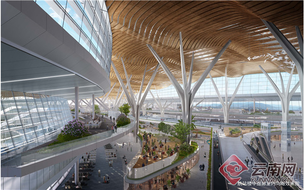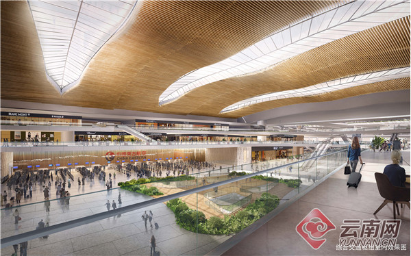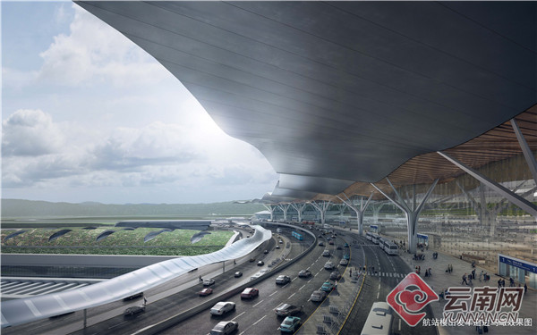 还体现了“绿色节能”的理念。“昆明一座四季如春的城市,结合当地气候条件,打造节能高效的生态机场。基于计算机模拟,通过建筑造型和自然通风的巧妙结合,尽量减少过渡季节对于空调的使用。 漫反射的柔和阳光为楼内60%以上的空间提供充足的自然采光,并成为旅客最好的向导。陆侧车库采取开敞式设计,打造零能耗生态车库。”