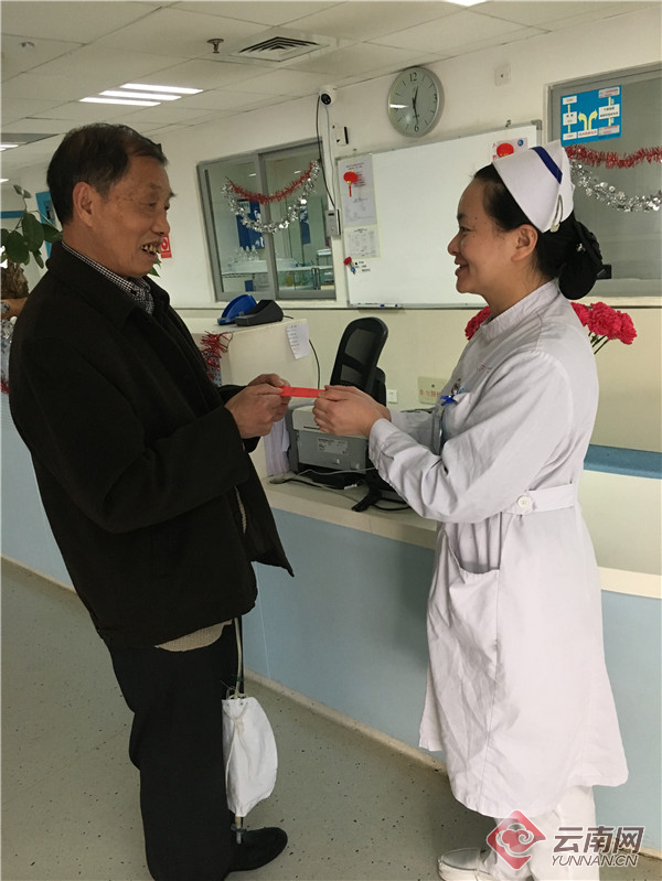 云南网讯(记者 彭锡)“每次过节你都买东西给我,实在不知说什么好了……”2月3日,一位杨姓老人紧紧拿着云南省第一人民医院泌尿外科副护士长保维莉递给自己的红包,眼含泪花,十分感动地表示。