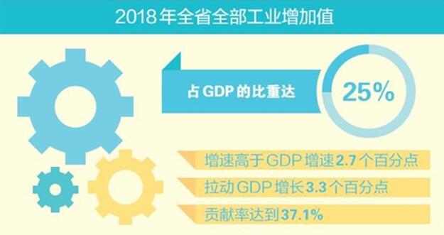 2018年,我省全部工业增加值占GDP的比重达25%,增速高于GDP增速2.7个百分点,拉动GDP增长3.3个百分点,贡献率达到37.1%。各行业中,工业对GDP增长贡献率最大。