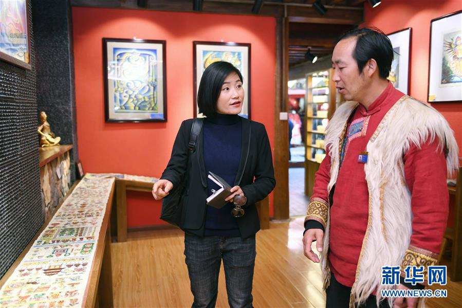 2月13日,范永贞(左)在云南丽江古城纳西象形文字绘画体验馆走访调研。新华社记者 杨宗友 摄