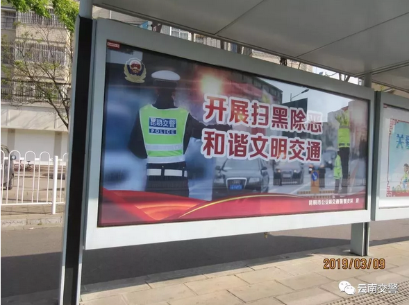 为助力扫黑除恶专项斗争工作,不断强化社会舆论声势,昆明市公安局交通警察支队在巩固前期宣传成果的基础上,不断整合资源,进行再动员、再部署,通过公交运行线路站台广告席位,再掀扫黑除恶专项斗争宣传攻势。