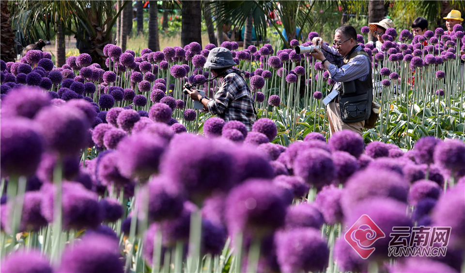 周末时分,在昆明植物园东园举行的首届葱属植物专题展吸引众多市民游人前来观赏,“球王”“大使”“神奇”“紫红巨人”“紫色动感”“夏天鼓手”“象牙皇后”等极具园艺观赏价值的花葱名品夺目盛放,形成艳丽的紫蓝色花海,把人们带进一个葱花灿烂、葱香四溢的奇异大观园。