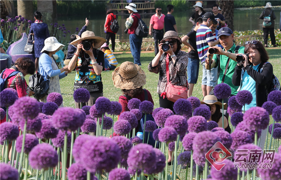 周末时分,在昆明植物园首届葱属植物专题展上,花葱盛开的美丽景致吸引市民游人驻足观赏、拍照留影
