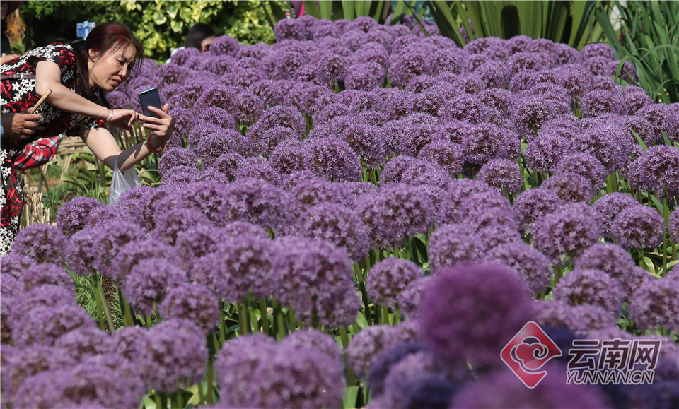 周末时分,在昆明植物园首届葱属植物专题展上,花葱盛开的美丽景致吸引市民游人驻足观赏、拍照留影