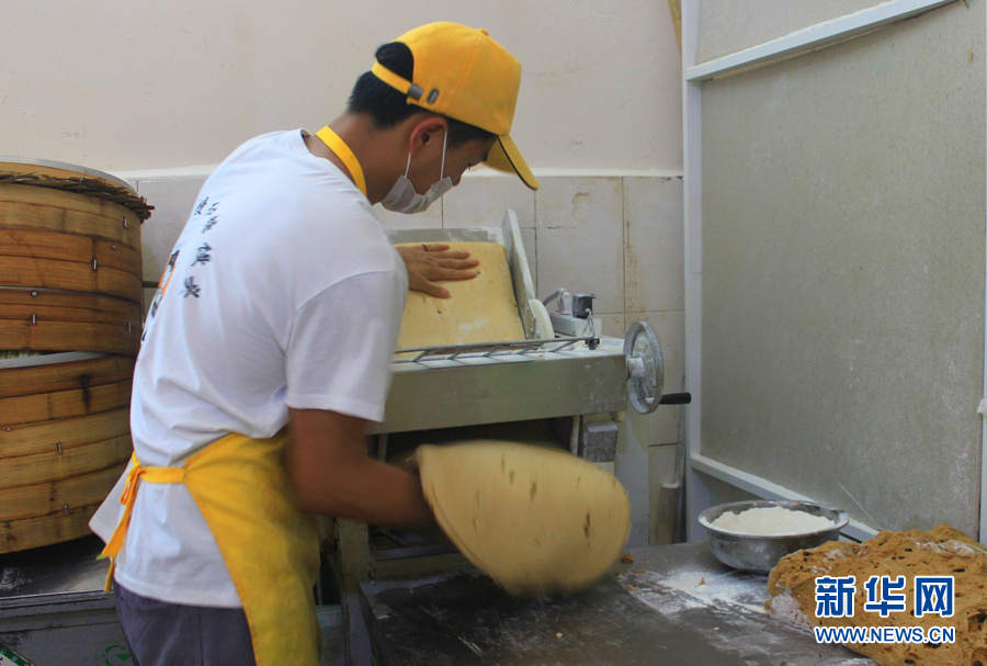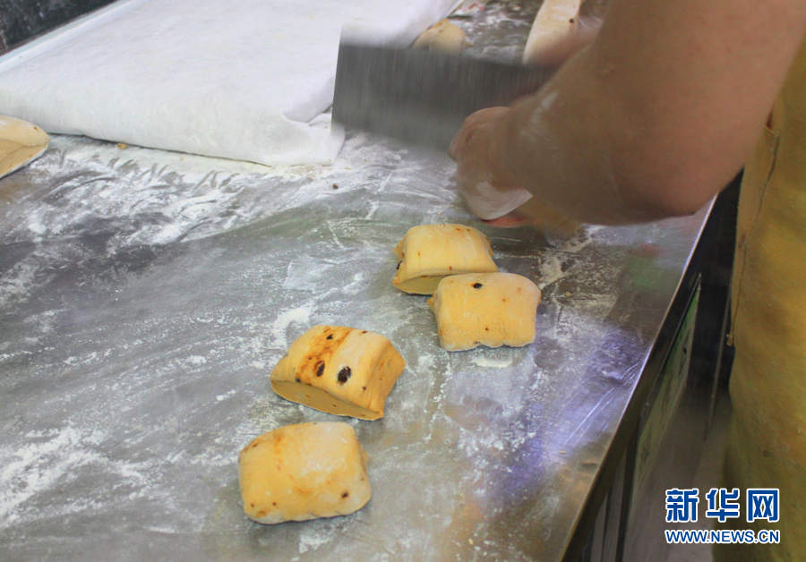 罗三长考虑到学校里的学生都是来自全国各地,能符合大众口味的吃食当中最普遍的是馒头。然而大家平时吃的大部分是白馒头,没有特点,毫无竞争力。经过市场调查他发现,沿海一带包括台湾,爱吃甜食,会在馒头里加糖,有的加白砂糖,有的加红糖。于是,他开始自己研究做红糖馒头,但始终不对味。图为面点师傅在切面。(新华网 石光良 文/摄)