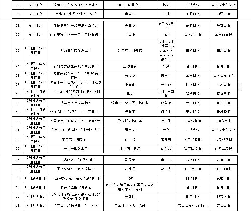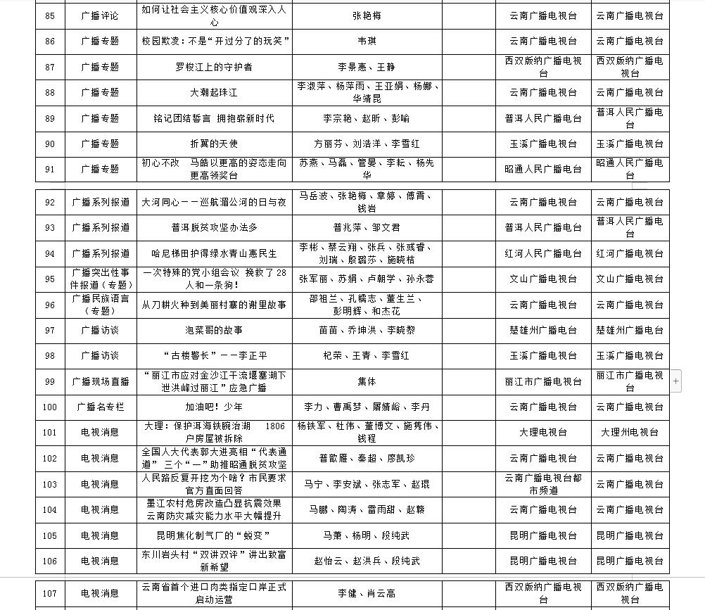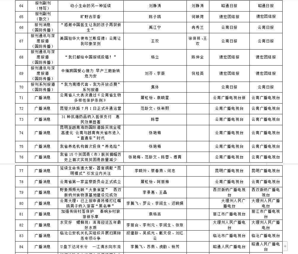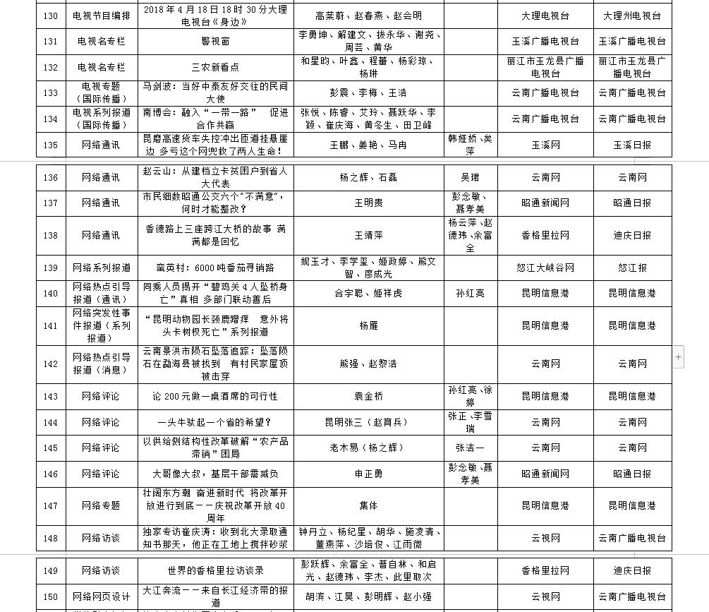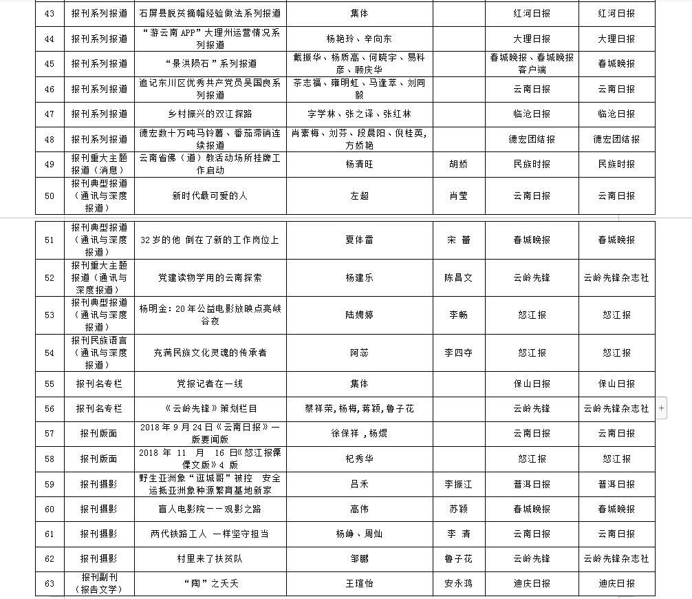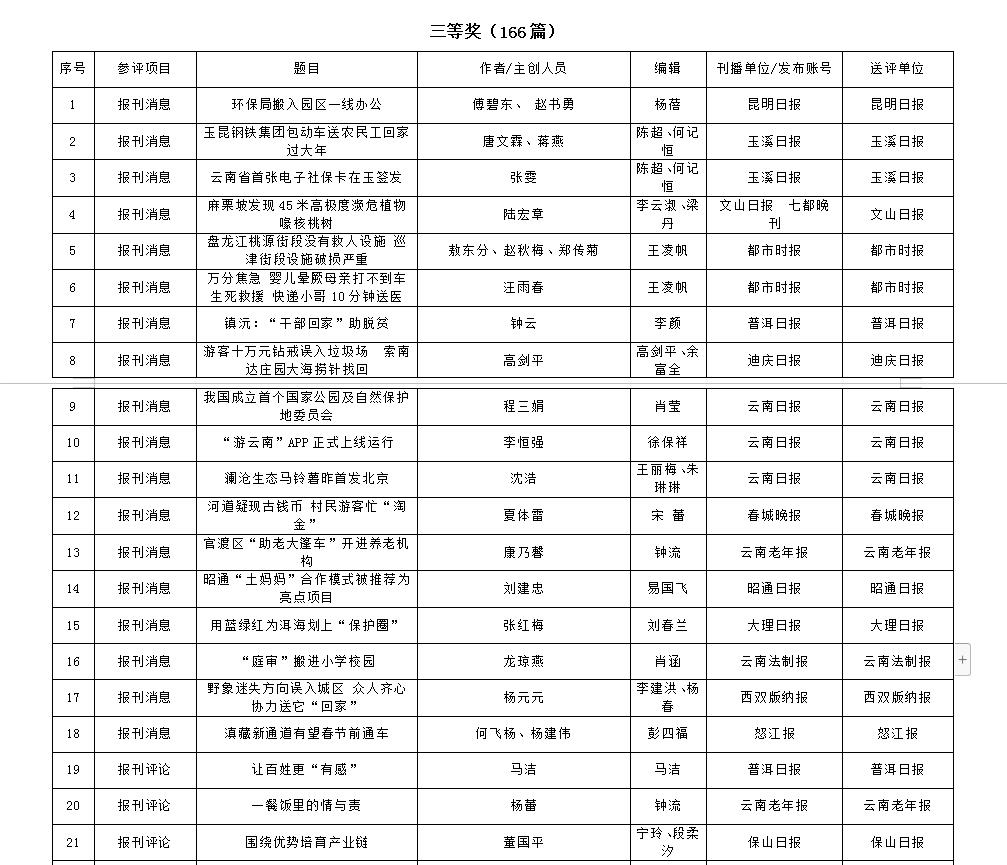由中共云南省委宣传部主办,云南省新闻工作者协会、云南省新闻学会承办的第35届云南新闻奖,以及由云南省新闻工作者协会、云南省新闻学会主办的2018年度云南新闻论文奖,经过初评、复评及定评三级评定,云南新闻奖评选出299件优秀新闻作品,其中特别奖2件,一等奖43件,二等奖88件,三等奖166件;云南新闻论文奖评选出63篇优秀论文作品,其中一等奖10篇,二等奖20篇,三等奖33篇。