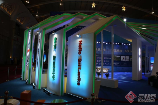 作为今年商洽会的主题国,斯里兰卡在昆明滇池国际会展中心7号馆特别呈现了一个以宝石切割面为设计灵感源的特装展示区。