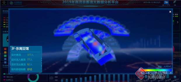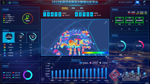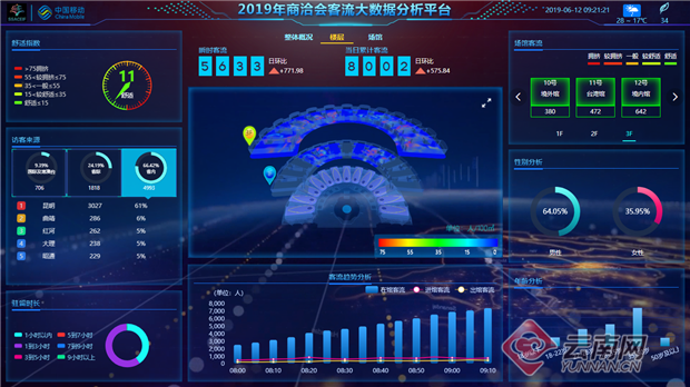 “游客来自于什么地方,目前哪个馆人数最多,这些都一目了然。”在观看了“2019年商洽会客流大数据平台”屏幕上显示的各种流量数据后,商洽会志愿者小吴觉得十分震撼。据云南移动大数据中心工作人员代照坤介绍,此平台利用防控区域的位置信令数据,通过大数据算法进行建模,精准、实时展示客流情况,其定位精度理论达到3至5cm,可全方位支撑不同的应用场景,如知名景点、大型活动(演唱会、马拉松)、重大集会等的客流监测。