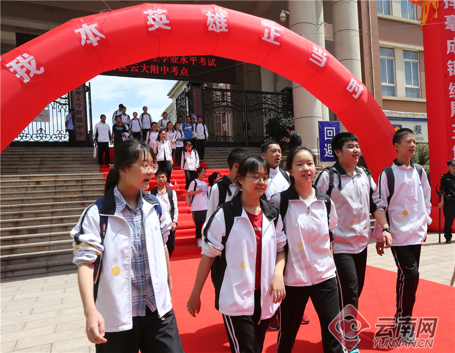 参加完语文考试的昆明市五华区云南大学附属中学考点的同学走出考场。