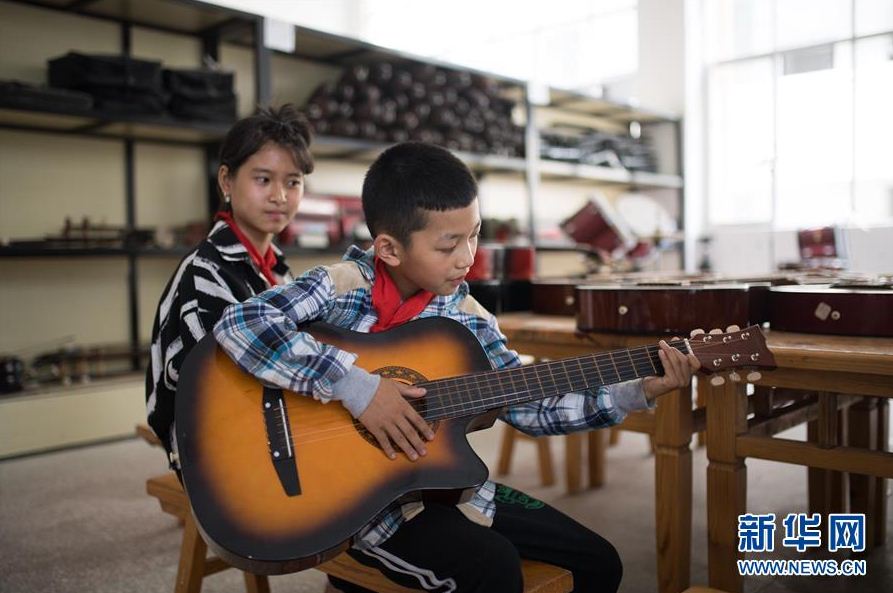6月25日,云南福贡县匹河完小五年级学生和建强在练习吉他弹奏。新华社记者 秦晴 摄