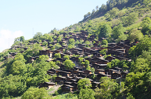 依山而建的木楞房错落有致地密布在半山腰上,村口整齐停放着一辆辆货车、小汽车和摩托车,通往各家的小路干净整洁。