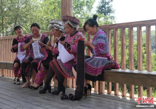 村民在长廊上唱歌和刺绣。张旭摄