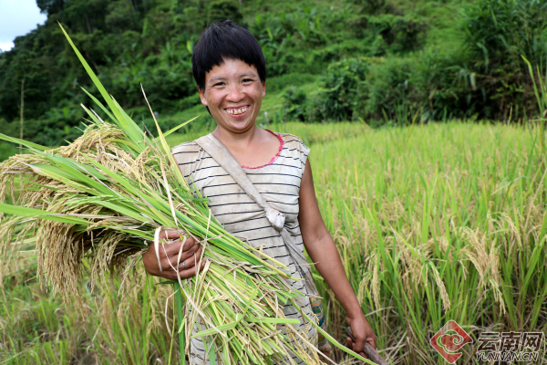 由村寨沿着一条简易的土路蜿蜒前行,记者看到一片片依山而开的水田内,除少部分正在收割的田块外,大多又栽上第二季水稻。在一片水稻长势特别好、金灿灿的稻田内,一名正在收割稻谷的女子见到记者一行“生人”时,笑得格外开心。她就是西双版纳州农业科学技术研究所前来抽样测量产量这块稻田的主人娜革。
