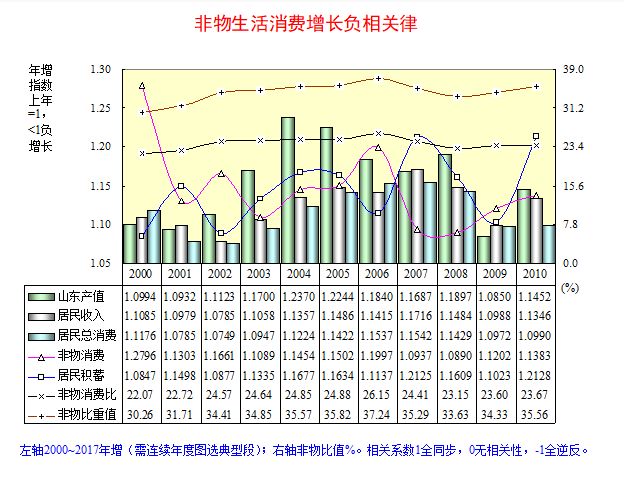2000~2017年山东增长相关系数:非物消费与产值之间0.07,相关性甚微;与居民收入之间0.08,相关性甚微;与居民积蓄之间-0.07,扩大回溯20年间1999~2013年-0.52,2004~2008年-0.79,负相关性显著,二者曲线呈峰谷对应水中倒影。非物消费比(占收入比)前6年极显著上升,后11年显著下降,17年升高1.37个百分点;非物消费比重(占总消费比)前6年极显著上升,后11年较明显下降,17年升高6.40个百分点。非物消费城乡比持续极显著缩小,17年缩减45.10%;地区差前6年略微扩大,后11年略微缩小,17年缩减5.80%。这些动态体现由衣食温饱“基本小康”到相对富余“全面小康”的“人民美好生活需要”变化。