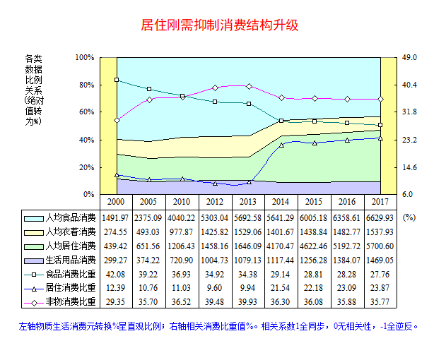2000年以来,江苏居民食品消费比(恩格尔定律关系)持续极显著下降,17年降低12.01个百分点;其与物质消费比之间历年变动相关系数0.5927,亦即59.27%程度同步;物质消费比持续极显著下降,17年降低8.43个百分点。食品消费比重(恩格尔系数)持续极显著下降,17年降低14.32个百分点;居住消费比重持续极显著上升,17年升高11.48个百分点;二者历年变动相关系数-0.7945,亦即79.45%程度逆反,后者升高“进占”比重很大程度填满前者降低“退让”比重,否则非物消费比重提升之“消费结构升级”更加显著。