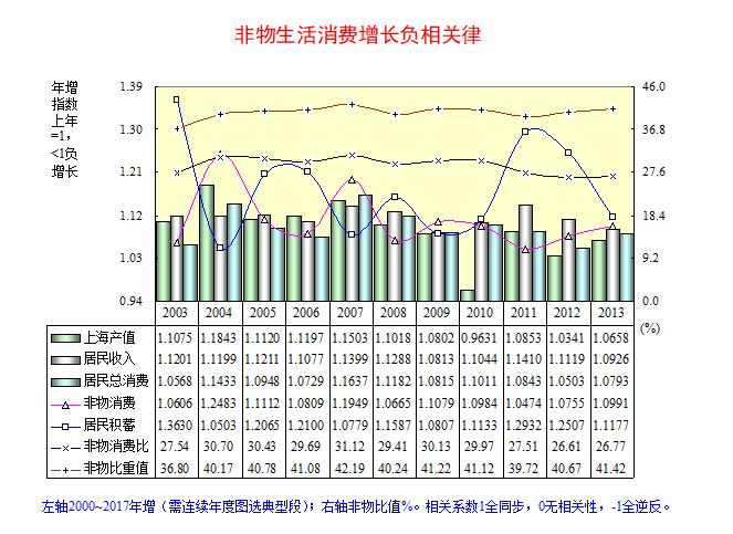 2000~2017年上海增长相关系数:非物消费与产值之间0.45,相关性很低;与居民收入之间-0.16,相关性逆反;与居民积蓄之间-0.10,其间2000~2013年-0.57,2009~2013年-0.97,负相关性显著,二者曲线呈峰谷对应水中倒影。非物消费比(占收入比)前7年极显著上升,后10年极显著下降,17年降低3.37个百分点;非物消费比重(占总消费比)前7年极显著上升,后10年极显著下降,17年降低1.06个百分点。非物消费城乡比前8年明显扩大,后9年明显缩小,17年缩减0.87%;地区差前1年略微扩大,后16年极显著缩小,17年缩减42.03%。这些动态体现由衣食温饱“基本小康”到相对富余“全面小康”的“人民美好生活需要”变化。