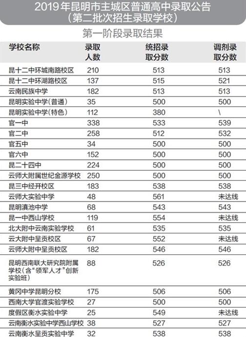昆明市招生考试院27日发布2019年昆明主城区普通高中录取公告(第二批次招生录取学校),公布了该批次第一阶段估分填报志愿录取结果和第二阶段征集志愿指标,以及定向择优生录取分数等信息。