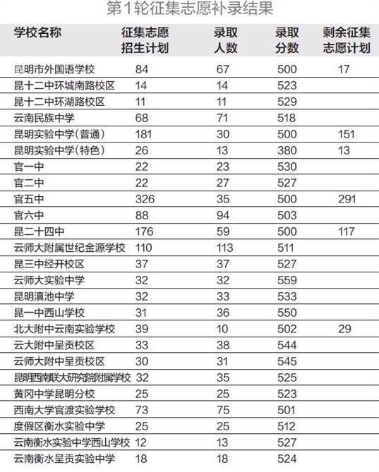 第二批次第2轮征集志愿时间为7月28日15时至29日11时。凡尚未被普通高中学校录取,符合条件的考生,还可参加征集志愿补录学校的录取。考分为500分以上的主城区考生,可参加昆二十四中征集志愿补录;考分为490分以上的主城区考生,可参加昆明市实验中学、官五中征集志愿补录;考分为500分以上的昆明市考生,可参加面向全市招生的昆明市外国语学校、北大附中云南实验学校征集志愿补录;考分为380分以上,有意报考昆明市实验中学特色班的考生,可到学校进行志愿填报及确认。