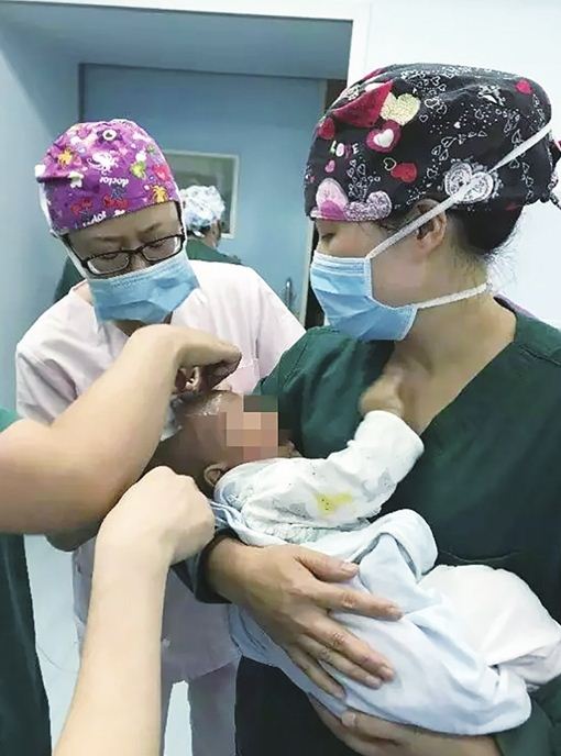 患儿因为离开妈妈,在手术室哭了起来,听到小宝贝的哭声,手术室的医护人员心疼得不得了。刚刚休完产假的护士李铁艳差点流下了眼泪,她主动要求参与手术,用一个新妈妈的爱心和娴熟的技能圆满地完成了手术器械的传递。