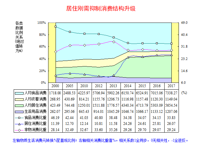 2000年以来,福建居民食品消费比(恩格尔定律关系)持续极显著下降,17年降低11.06个百分点;其与物质消费比之间历年变动相关系数0.2550,亦即25.50%程度同步;物质消费比持续极显著下降,17年降低4.47个百分点。食品消费比重(恩格尔系数)持续极显著下降,17年降低12.36个百分点;居住消费比重持续极显著上升,17年升高14.68个百分点;二者历年变动相关系数-0.8839,亦即88.39%程度逆反,后者升高“进占”比重反而已经超出前者降低“退让”比重,否则非物消费比重提升之“消费结构升级”更加显著。