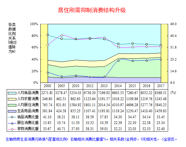 2000年以来,广东居民食品消费比(恩格尔定律关系)持续极显著下降,17年降低7.65个百分点;其与物质消费比之间历年变动相关系数-0.0512,亦即-5.12%程度同步;物质消费比持续显著下降,17年降低2.11个百分点。食品消费比重(恩格尔系数)持续极显著下降,17年降低7.65个百分点;居住消费比重持续极显著上升,17年升高9.49个百分点;二者历年变动相关系数-0.8177,亦即81.77%程度逆反,后者升高“进占”比重反而已经超出前者降低“退让”比重,最终导致非物消费比重跌降之“消费结构逆升级”。