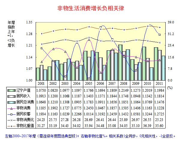 2000~2017年辽宁增长相关系数:非物消费与产值之间-0.16,相关性逆反;与居民收入之间-0.04,相关性逆反;与居民积蓄之间-0.66,扩大回溯20年间1997~2017年-0.64,2001~2006年-0.93,负相关性显著,二者曲线呈峰谷对应水中倒影。非物消费比(占收入比)前16年极显著上升,近1年略微下降,17年升高5.85个百分点;非物消费比重(占总消费比)持续极显著上升,17年升高10.38个百分点。非物消费城乡比前4年显著扩大,后13年极显著缩小,17年缩减21.10%;地区差前16年略微扩大,近1年略微缩小,17年扩增11.36%。这些动态体现由衣食温饱“基本小康”到相对富余“全面小康”的“人民美好生活需要”变化。