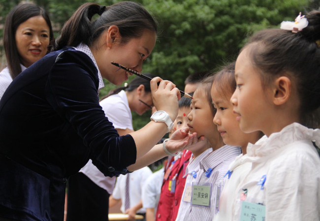 盘龙区金康园小学同样用开笔礼迎接了420名新同学。学生们整理好衣冠,向老师行天揖礼,同学之间互行拱手礼,学校老师还在孩子们的额头上点上了朱砂。之后,老师们还教一年级小朋友学写“人”字。据了解,这已经是该校第三年举行开笔礼,旨在给予学生们鼓励、希望、祝福,传承中国传统文化。