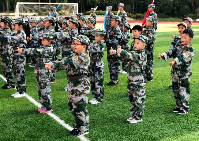 春城玖如堂小学2019年秋季学期“雄风春小,科技军事”研学营也在上周六闭幕,学生们穿着统一的迷彩服,为家长和老师展示了为期7天的训练成果。既有队列展示和军体拳展示,全校学生还表演了手语操《感谢》。