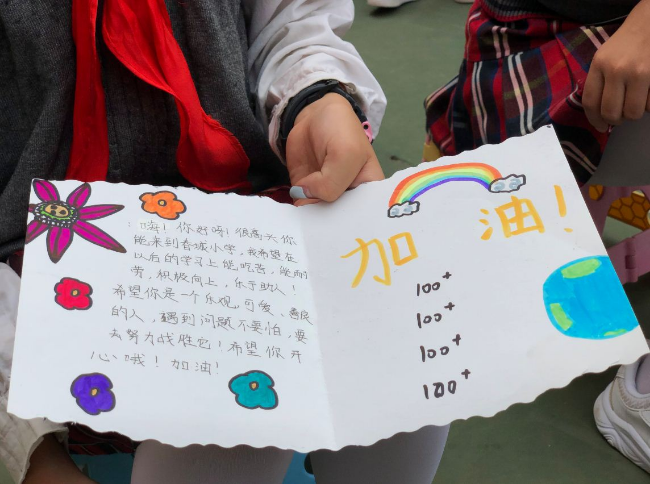 春城小学一年级娃娃们进校的第一天,就有了帮扶他们的哥哥姐姐。开学典礼上,六年级学生与一年级新生一对一结对,并把他们亲手制作的贺卡送给了弟弟妹妹们。六(2)班桂小迪在贺卡上画上了花朵、彩虹等图案,还写下了她对小妹妹的祝福,希望她“遇到问题不要怕,要努力战胜它”。桂小迪说,她希望自己能带领妹妹一起学习、成长。和桂小迪结对的一(2)班的李沁璇说,能够认识大姐姐,自己非常开心。