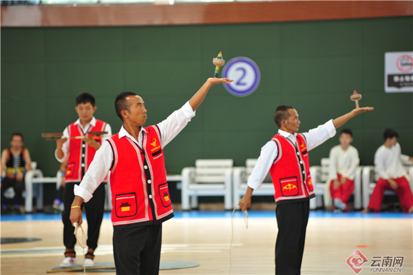 8月中旬,我省参加第十一届全国民族运动会10个表演项目的近200名运动员抵达昆明,进行赛前的最后备战。今年,我省一共从文山、红河、楚雄、玉溪、德宏、迪庆、保山、临沧等州市精挑了10个表演项目,其中,竞技类有《挑箕乐》《搭火把》《抢龙宝》《稻花鱼丰收赛》《欢乐收青稞》5个项目;综合类有《彝山花鼓》《新米节》《响山板》《傣族女创拳》4个项目;另外还有技巧类的《陀螺飞旋》。在半个月的集中训练中,运动员们每天训练时间十几个小时,在体能、技术、编排等各方面进行精雕细琢。
