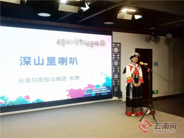 9月2日,在云南省新闻界第六届“好记者讲好故事”演讲比赛现场,云南日报丽江分社记者和茜手持喇叭,这是她采访的对象每天都要使用的工具。