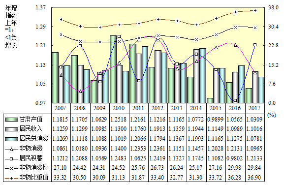 2000~2017年甘肃增长相关系数:非物消费与产值之间-0.22,相关性逆反;与居民收入之间0.02,相关性甚微;与居民积蓄之间-0.56,扩大回溯20年间1999~2017年-0.57,2013~2017年-0.82,负相关性显著,二者曲线呈峰谷对应水中倒影。非物消费比(占收入比)前16年极显著上升,近1年略微下降,17年升高6.00个百分点;非物消费比重(占总消费比)持续极显著上升,17年升高7.11个百分点。非物消费城乡比前2年明显扩大,后15年极显著缩小,17年缩减47.72%;地区差前10年略微扩大,后7年较明显缩小,17年缩减9.28%。这些动态体现由衣食温饱“基本小康”到相对富余“全面小康”的“人民美好生活需要”变化。