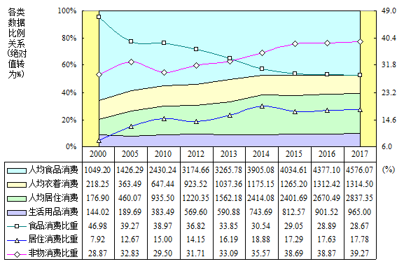 2000年以来,青海居民食品消费比(恩格尔定律关系)持续极显著下降,17年降低15.03个百分点;其与物质消费比之间历年变动相关系数0.7843,亦即78.43%程度同步;物质消费比持续极显著下降,17年降低8.77个百分点。食品消费比重(恩格尔系数)持续极显著下降,17年降低18.31个百分点;居住消费比重前14年极显著上升,近3年明显下降,17年升高9.86个百分点;二者历年变动相关系数-0.9177,亦即91.77%程度逆反,后者升高“进占”比重较大程度填充前者降低“退让”比重,否则非物消费比重提升之“消费结构升级”更加显著。