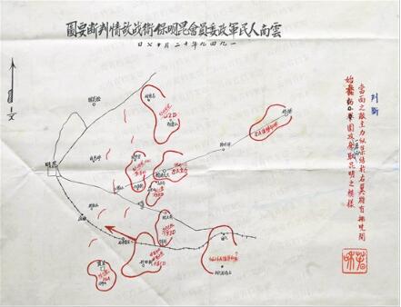 1949年12月17日昆明起义后由卢汉组建的云南人民临时军政委员会,在昆明受到围攻之际绘制了昆明保卫战敌情判断要图,标明“当面之敌主力似集结于右翼,将有拂晓开始围攻,一举而夺取昆明之模样”。