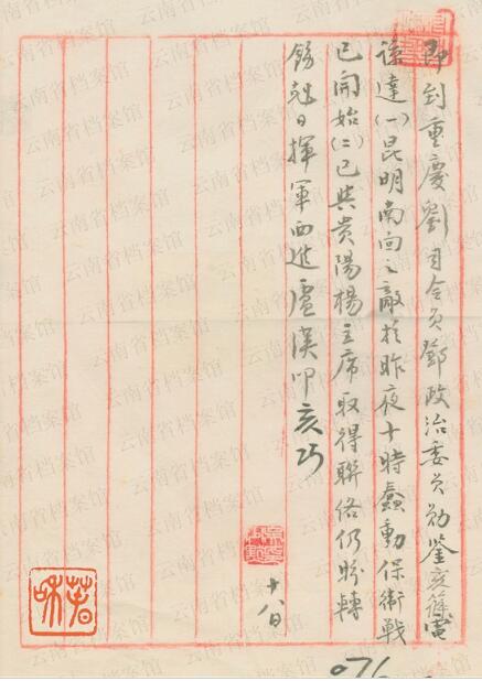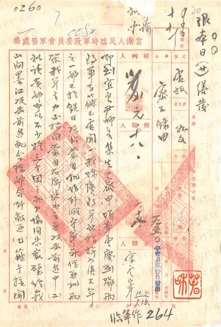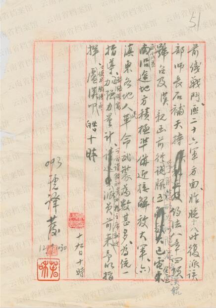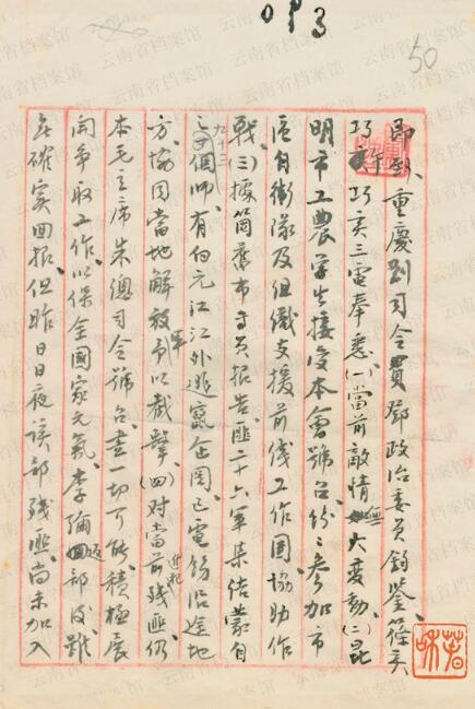 1949年12月19日卢汉向刘伯承、邓小平致电报告:“(一)当前敌情无大变动。(二)昆明市工、农、学生接受本会号召,纷纷参加市区自卫队及组织支援前线工作团,协助作战。(三)据个旧市专员报告,匪二十六军集结蒙自之九十三师,有向元江江外逃窜企图。已电饬沿途地方,协同当地解放军予以截击。(四)对当前进犯残匪,仍本毛主席、朱总司令号召,尽一切可能,积极展开争取工作,以保全国家元气……(五)已电令宣威、沾益沿途地方,积极准备迎接解放大军……”