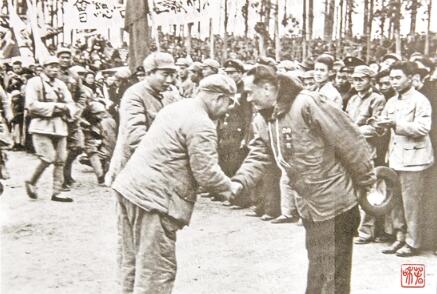 1950年2月20日下午一时,隆重的入城仪式正式开始,云南人民临时军政委员会主席卢汉(右一)率领军政人员到昆明东郊迎接二野四兵团司令员陈赓(左)、政治委员宋任穷(左后)率领的解放大军和西南服务团云南支队。