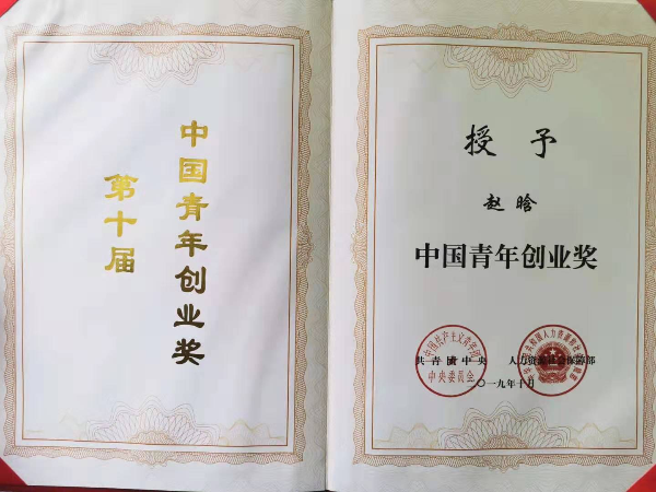 “中国青年创业奖”由共青团中央、人力资源社会保障部于2004年联合设立,表彰创业事迹突出、为经济社会发展作出重要贡献的中国青年创业者。评选表彰活动自2007年起每两年评选一次,至今已连续开展十届,表彰了137名优秀青年创业者。第十届“中国青年创业奖”中,共有20人“中国青年创业奖”,6人获“中国青年创业奖·脱贫攻坚特别奖”, 6人“中国青年创业奖·促进就业特别奖”。赵晗获得“中国青年创业奖”。