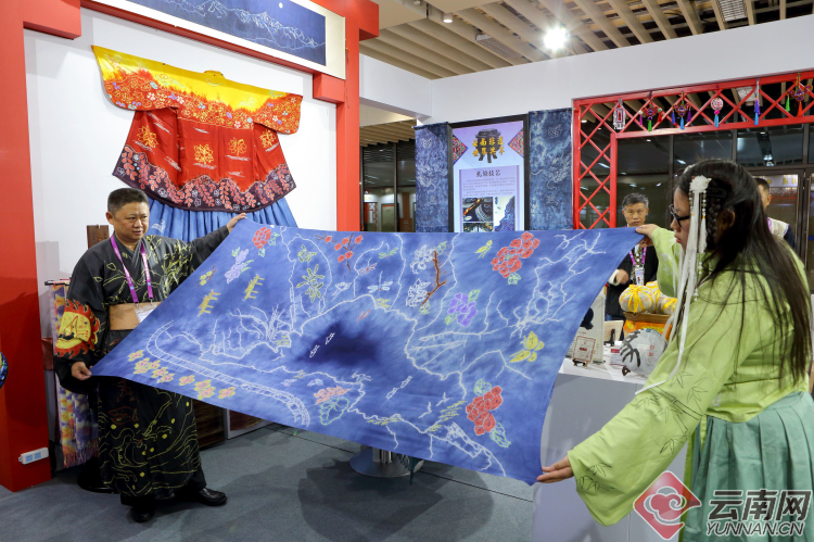 扎染技艺传承人杨承与杨语嫣展示用扎染制作出的昆明滇池、金马碧鸡坊、高铁等美丽画卷。记者 雷桐苏 摄