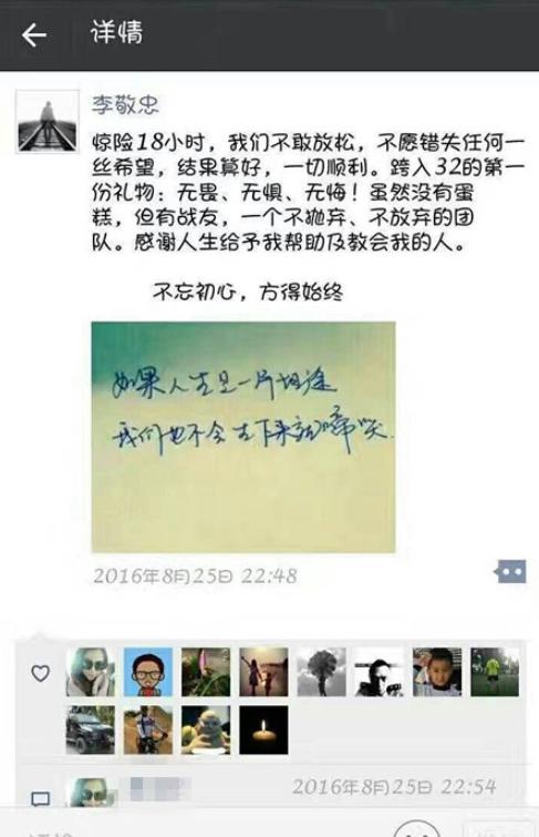 在破获一起毒品案后,李敬忠在微信朋友圈写道:“惊险18小时,我们不敢放松,不愿错失任何一丝希望,结果算好,一切顺利。跨入32岁的第一份礼物:无畏、无惧、无悔!虽然没有蛋糕,但有战友,一个不抛弃、不放弃的团队。感谢人生给予我帮助及教会我的人。”