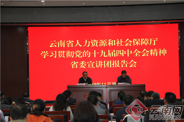 云南网讯(记者 杨萍)11月28日下午,学习贯彻党的十九届四中全会精神云南省委宣讲团报告会在省人力资源和社会保障厅举行。省委宣讲团成员,省委组织部副部长,省人力资源社会保障厅党组书记、厅长杨榆坚作宣讲报告。