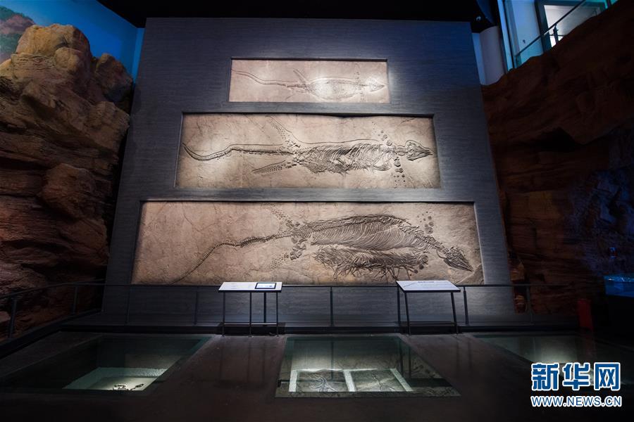 这是澄江化石地自然博物馆内展示的海生爬行动物化石(12月26日摄)。新华社记者 胡超 摄