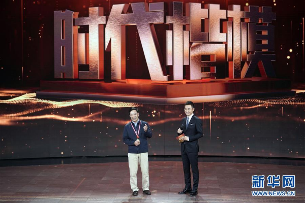朱有勇(左)在“时代楷模”发布仪式现场接受采访(11月29日摄)。新华社记者 金良快 摄