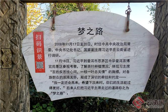 2008年11月17日至20日,时任中共中央政治局常委、中央书记处书记、国家副主席的习近平来滇调研。18日,在普洱市思茅区万亩茶园,习近平向茶农了解茶叶种植情况,把对各族群众的浓浓关怀,凝成了深切牵挂和约定:“我一定还会再来,希望下次来时,你们的生活能过得更好。”后来,乡亲们亲切地把他走过的这条路称为“梦之路”。