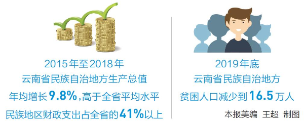 从实施三轮示范区建设“十县百乡千村万户示范创建工程”,到协调三峡集团等5家大型国有企业集团帮扶云南“直过民族”和人口较少民族脱贫攻坚,全省乃至全国的政策、资金、项目、人才不断向民族地区汇聚,少数民族和民族地区全面脱贫、全面建成小康社会的步伐不断加快。14个贫困的自治县脱帽,独龙族、德昂族和基诺族实现整族脱贫。2019年底,云南省民族自治地方贫困人口减少到16.5万人。