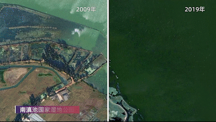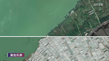 2009年、2019年,滇池东南部区域卫星对比图。银灰色的蔬菜大棚、连片的鱼塘被拆除,取而代之的是古滇湿地公园宁静的湖面。湖进人退,滇池摆脱水污染“绝症晚期”,恢复生机。